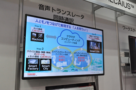 東芝が長年培ってきたメディアインテリジェンス技術を融合し、音声や映像から人の意図や状況を理解し、わかりやすく伝え、さまざまな活動をサポートすることを目指したクラウドサービスがRECAIUSです。音声をテキスト化できる「RECAIUS音声ビューア/音声認識サービス」や、テキストを音声化する「RECAIUS音声クリエータ/音声合成サービス」など、目的に合わせてさまざまなサービスが用意され自由に組み合わせることができます。会場では話していることを次々とリアルタイム翻訳できる「RECAIUS音声トランスレータ/同時通訳サービス」のデモを行いました。日英/英日、日中/中日、日韓の4ヶ国語に対応し、長い文でも気にせずスマートフォンに向かって次々と話しかけると翻訳されていく様子は、来場者に驚きを持って見つめられていました。
