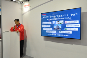 東芝はワークスタイルを「チェンジ」するのではなく、さらに一歩進めた「変革」を目指し、新しい働き方で企業のパフォーマンスを向上する、クラウドを活用したワークスタイル変革ソリューションを提供しています。東芝の考える新しいワークスタイルでは、時間や場所にとらわれず、いつでも、どこでもセキュアに業務を行える「タイム」、組織や人脈を超えたコラボレーションで社内に分散する知見を結集する「プロセス」、ユーザーの意図を汲み取るインターフェースで快適に業務を進める「インターフェース」の3つを重視しています。2013年11月から川崎スマートコミュニティセンターは、新しいワークスタイルを実践できる最新のスマートオフィスとして稼働しています。また、フィールドサービスワークスタイル変革では、マニュアルや作業指示書といった保守資料を電子化し、文書管理システムEiplaza/DMで担当のタブレット端末へ自動配信します。モバイルコンテンツ管理サービスEiplaza/MBでは暗号化や自動削除も実装されセキュアに運用できることなど、新しい働き方を紹介しました。