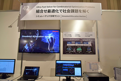 先進技術のエリアでは、組み合わせ最適化問題を解くシミュレーテッド分岐マシンを展示し、渋滞緩和やポートフォリオ最適化、創薬のための分子設計などの例をパネルで紹介した。太陽光発電量を予測する技術では、独自の気象予測システムから得られるデータを活用し、過去の発電実績をもとにAI技術で正確な推定ができることを説明。その他、人物画像、アナリティクス、エネルギー管理など幅広い分野でのAI活用の展示を行った。
