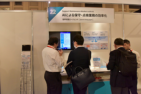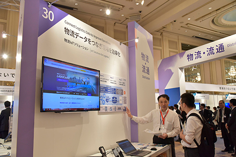 “産業をつないで届ける”物流・流通エリアでは、物流IoTデータ活用することで現場を効率化するソリューション・サービスや、コミュニケーションAIを活用しお客様応対業務の省力化とサービス品質の向上を実現するソリューション展示を行った。物流データをつなぎ見える化・分析することで現場業務を効率化する物流IoTソリューション「LADOC Suiteシリーズ」では、RFIDで輸送器材を追跡・所在管理する「LADOC Suite/LogiTrace」などを紹介。また、需要予測に基づく適正な在庫の算出により値引きや廃棄、売り逃しなどのロス改善で売り上げを向上させる「在庫最適化コンサルティングサービス」などを展示。流通・サービス分野では、画像認識・音声技術・AIを搭載した「音声オーダーシステム」を飲食店内を再現したデモを交えて紹介したほか、お客様とのコミュニケーション業務の効率化と品質向上を実現する「RECAIUS フィールドボイスインカム」などを展示。